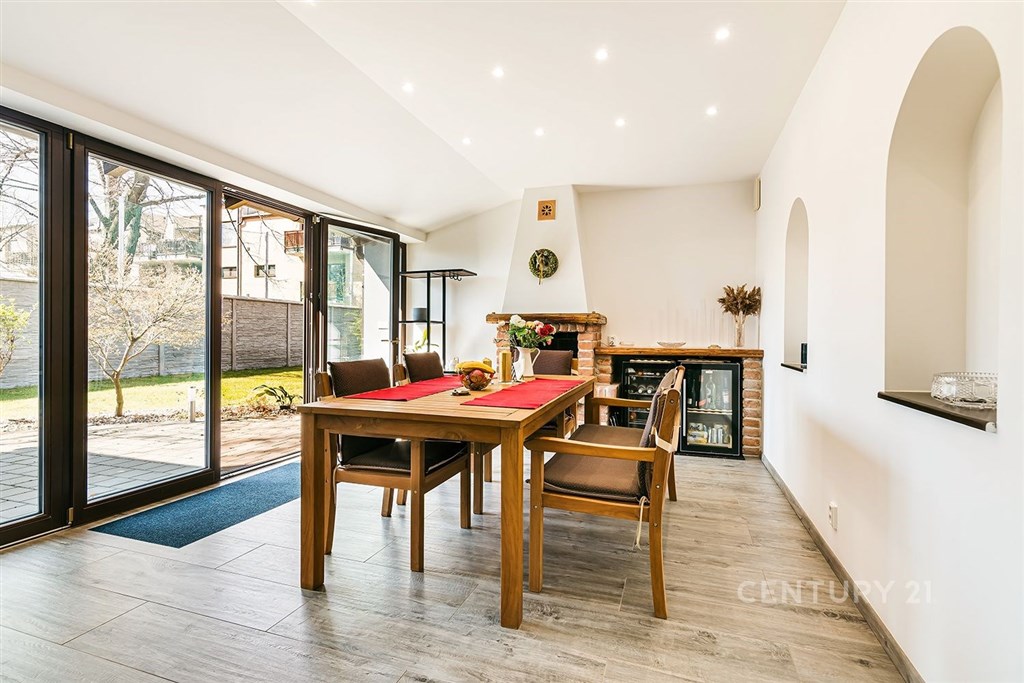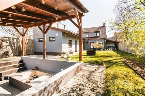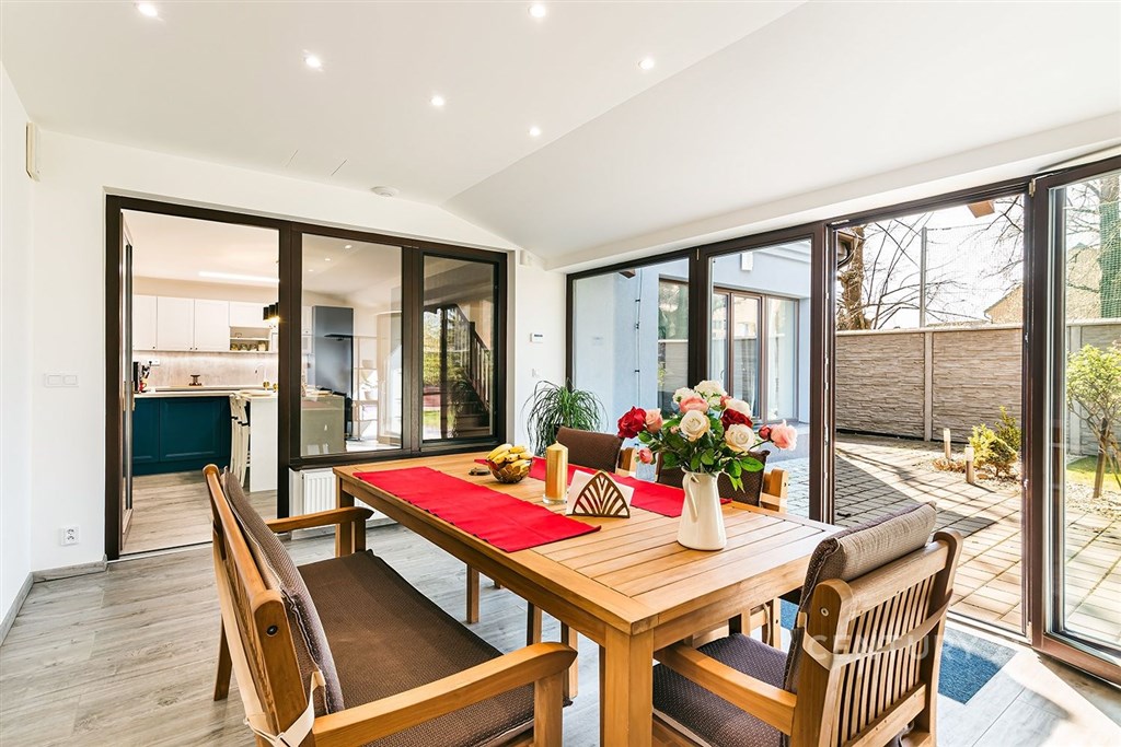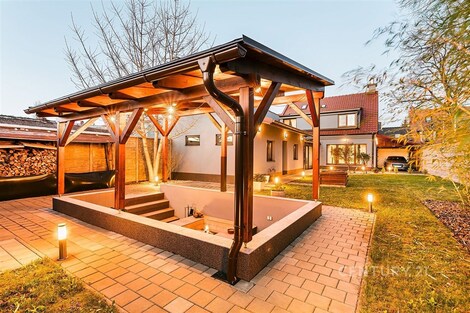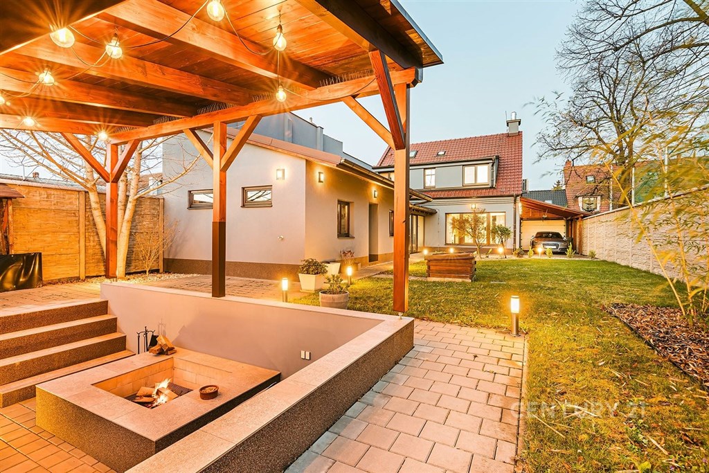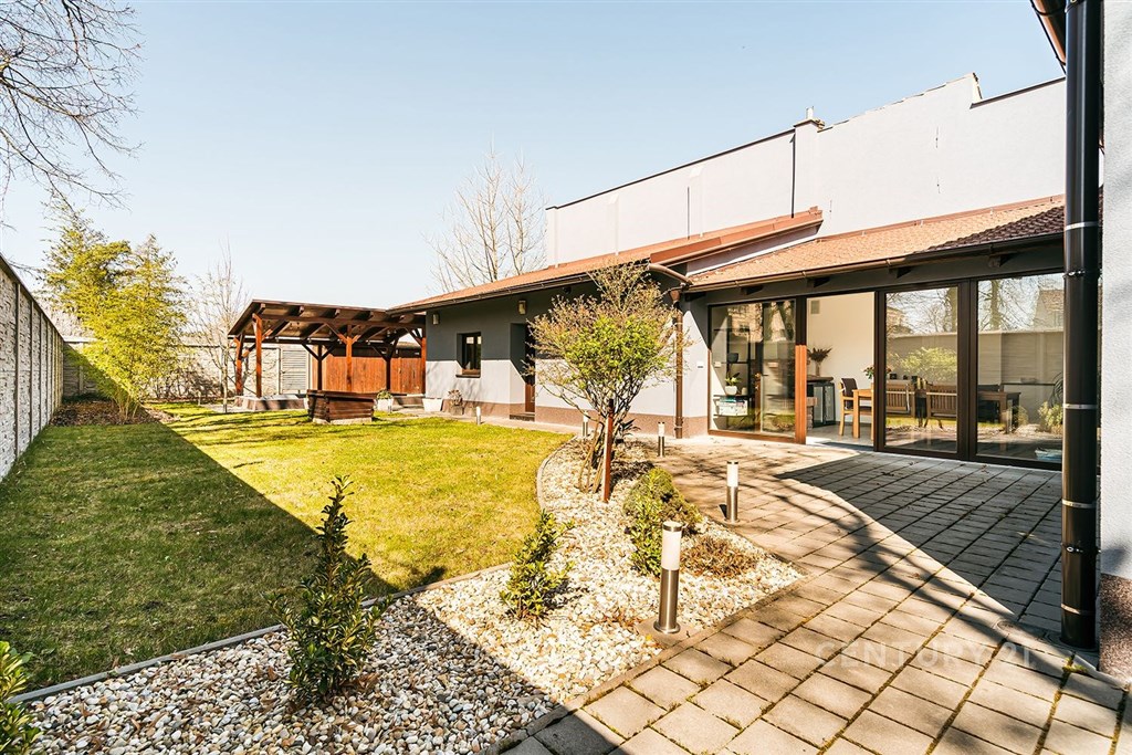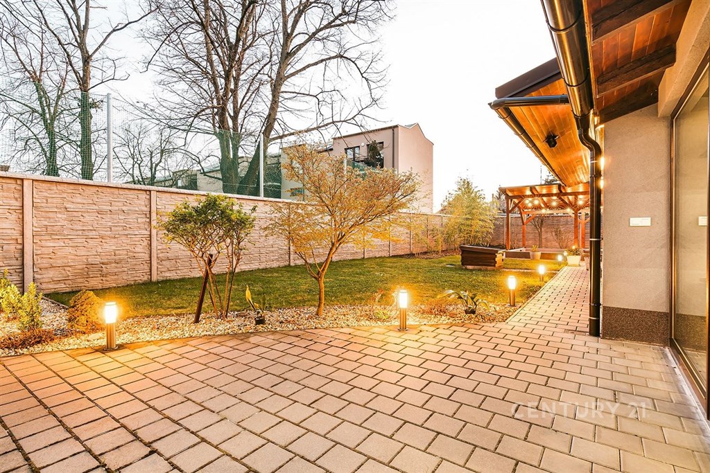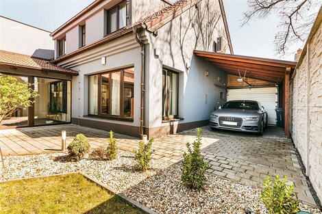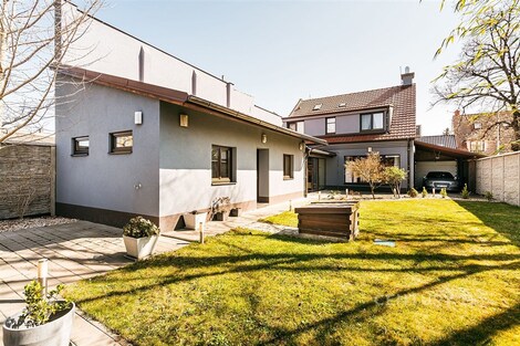 Jedinečný rodinný dům po kompletní rekonstrukci, situovaný v městské části Brno - jih, v Přízřenicích. Tato nemovitost zaujme na první pohled: jak svým promyšleným dispozičním řešením, tak nadstandardní kvalitou použitých materiálů: okna s izolačními trojskly, kompletní zateplovací systém, schodiště z masivu, zabezpečovací systém, nábytek na míru, vestavěné promítací plátno atd. Dům je napojený na všechny inženýrské sítě, ale má i vlastní studnu, na niž je napojena automatická závlaha trávníku. Vytápění objektu zajišťuje plynový kotel, v přízemí a v horní koupelně je podlahové topení a v obývacím pokoji funkční krb. Užitná plocha domu činí cca 218 m2, a kromě obytných místností nabízí také prostornou dílnu, prádelnu, pochozí půdu. Interiéry byly realizovány pod dohledem bytové designérky, každá místnost působí harmonicky a stylově navazuje na ty ostatní. V přízemí domu je předsíň s vestavěnými skříněmi, pracovna, koupelna se sprchovým koutem, samostatná toaleta, a dále obývací pokoj a kuchyně orientované do zahrady. Na kuchyni navazuje prosklená zimní zahrada sloužící jako jídelna i relaxační zóna. V podkroví naleznete pracovnu, ložnici se šatnou, pokoj pro hosty, velkou koupelnu se zabudovanou saunou a vstup na půdu. Půdorys stavby vytváří klidnou relaxační zónu a zajišťuje naprosté soukromí. Zahrada je okrasná, najdete zde zapuštěné posezení pod pergolou, trávník s automatickou závlahou, okrasné keře i nenápadný dřevník, kam uložíte vše potřebné např. pro zahradní párty. Uvolnění domu je možné ihned po přepisu na nového majitele. Lokalita je příjemná, s výbornou dostupností do centra Brna i na dálnici D1 a D2. V blízkosti se nachází OC Olympia, Avion Shopping Park, škola, školka, obchod s potravinami i kavárna. Pro sportovní a volnočasové aktivity můžete využít nedalekou cyklostezku Brno - Vídeň, sportovní areál Kšírovka či koupaliště biotop Brno - jih. Zastávka MHD je pár kroků a zastavuje zde i noční autobus N94. Tento dům je ideální volbou pro náročného klienta, který hledá komfortní, bezúdržbové a reprezentativní bydlení, které má styl a zároveň plně slouží praktickým potřebám každodenního života. Neváhejte mě kontaktovat pro více informací nebo domluvení osobní prohlídky - tento dům stojí za to vidět!