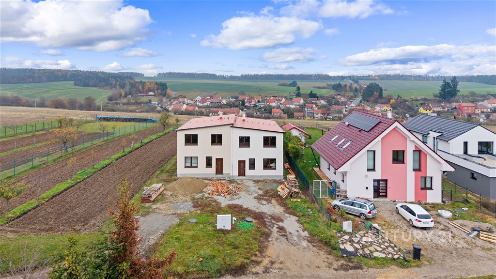 Aktualizace: Hrubá stavba dokončena! Nabízím k prodeji polovinu moderního patrového dvojdomku, který je aktuálně ve výstavbě v obci Příbram na Moravě. Dům je situován na velkorysém pozemku o rozloze 767 m2 s krásným výhledem do okolní krajiny. Ideální podmínky pro rodinný život - dostatek prostoru pro děti, soukromí i možnost vybudovat si vlastní zahradu, terasu či dětské hřiště. Dům se prodává ve fázi hrubé stavby, která zahrnuje kvalitní okna Rehau Geneo, vstupní dveře a dokončenou fasádu. Venkovní části okenních rámů a vchodové dveře jsou v elegantním odstínu ořech, který podtrhuje přirozený vzhled stavby a krásně ladí s okolní přírodou. Uvedená cena se vztahuje výhradně na tuto fázi hrubé stavby. V případě zájmu je možné zajistit dokončení stavby do stavu k nastěhování (bez kuchyňské linky). Dispozice domu je řešena velmi chytře 5+kk, s praktickým rozdělením na denní a noční zónu. Součástí domu je také technická místnost, spíž, dvě koupelny a dvě samostatné toalety. Užitná plocha činí cca 140 m2, což zajišťuje pohodlné bydlení i pro vícečlennou rodinu, či práci z domu. Tato nemovitost je skvělou příležitostí pro ty, kteří hledají klidné a bezpečné místo pro život s dětmi (i bez :)), s dobrou dostupností do Brna. Díky tomu, že se dům prodává ve fázi hrubé stavby, máte možnost finální podobu interiéru plně přizpůsobit svým představám. K prodeji jsou obě poloviny domu. Pro více informací mě neváhejte kontaktovat.