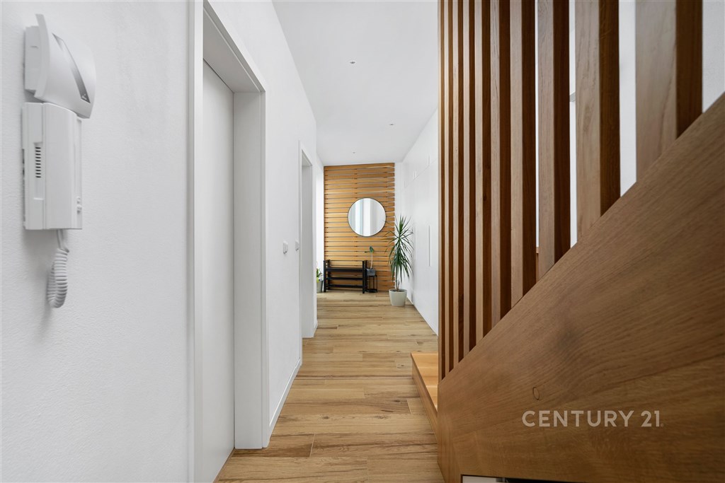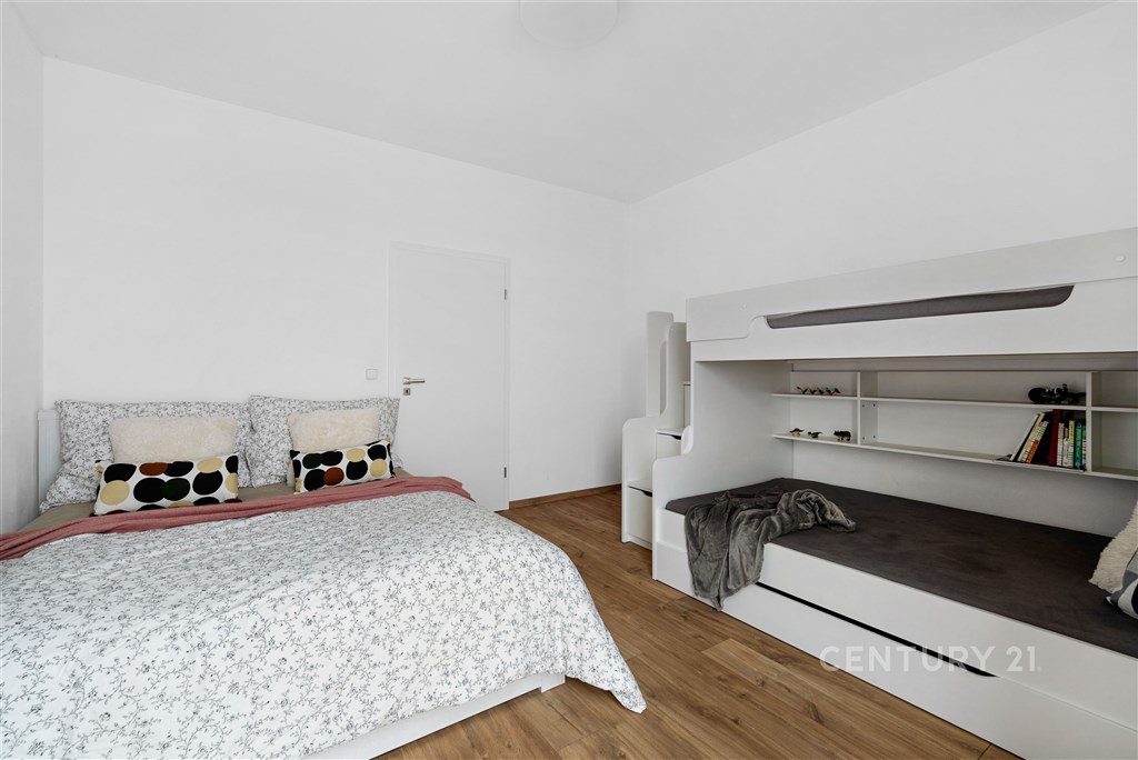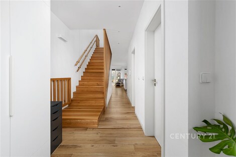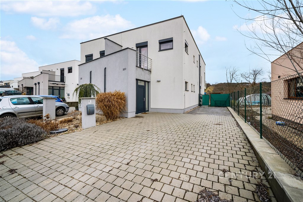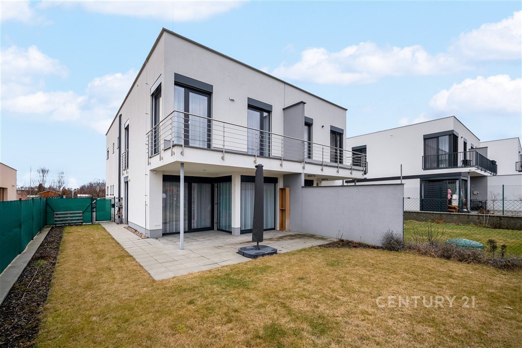 Představte si domov, kde ráno otevíráte okna do klidné krajiny, kde máte dostatek prostoru pro rodinu i vlastní soukromí a přitom jste za pár minut v Brně. V oblíbené obci Hajany nabízíme moderní rodinný dům o dispozici 4+kk a užitné ploše 147,5 m2 na pozemku o velikosti 612 m2, kolaudovaný v roce 2021. Dům splňuje energetickou třídu B, tedy velmi úsporný standard, který zajišťuje dlouhodobě příznivé provozní náklady. Tato nemovitost spojuje současnou architekturu, kvalitní provedení a příjemnou atmosféru místa, kde se budete cítit opravdu doma. První nadzemní podlaží tvoří otevřený a velkorysý obytný prostor, který přirozeně propojuje obývací část, jídelnu a kuchyni. Kuchyňská linka s ostrůvkem nabízí dostatek pracovní i úložné plochy a díky svému čistému designu působí nadčasově. Velkoformátová okna přivádějí do interiéru dostatek přirozeného světla a umožňují přímý vstup na terasu a zahradu, čímž vytvářejí plynulé propojení interiéru s exteriérem. Na tomto podlaží se dále nachází vstupní chodba s úložnými prostory, pracovna, technická místnost a samostatné WC. Dispozice je praktická, promyšlená a vhodná pro každodenní rodinný život i setkávání s přáteli. Horní podlaží je vyhrazeno klidové části domu. Nacházejí se zde tři samostatné pokoje, které mohou sloužit jako ložnice, dětské pokoje nebo pracovna. Hlavní ložnice nabízí přímý vstup na balkon s výhledem do okolní zeleně, což vytváří příjemný pocit prostoru a soukromí, vlastní koupelnu a šatnu. Součástí patra je prostorná koupelna v moderním designu s vanou i sprchovým koutem a samostatné WC. Celé podlaží působí světlým a vzdušným dojmem a poskytuje dostatek komfortu pro všechny členy domácnosti. Pozemek o velikosti 612 m2 nabízí dostatek prostoru pro relaxaci, rodinné aktivity i případné budoucí úpravy podle vlastních představ. Na obytnou část plynule navazuje terasa, která vytváří ideální místo pro každodenní posezení i letní setkávání s přáteli. Otevřený výhled do okolní krajiny za domem podtrhuje pocit klidu, soukromí a prostoru, který je v této lokalitě velmi příjemným benefitem. Součástí zahrady je retenční nádrž s možností dopouštění z vodovodu a technologie pro automatické zavlažování trávníku, což usnadňuje údržbu a zvyšuje komfort užívání. Parkování je zajištěno přímo na vlastním pozemku, a to s dostatečnou kapacitou pro více vozidel. Dům je postaven z cihelného zdiva Porotherm 30 Profi a zateplen minerální vatou o tloušťce 150 mm. Energetická náročnost budovy odpovídá třídě B, tedy velmi úsporné kategorii, což se pozitivně promítá do dlouhodobých nákladů na provoz. V celém domě je instalováno podlahové vytápění napojené na plynový kotel a plastová okna jsou osazena izolačními dvojskly. Provozní náklady jsou stabilní a přehledné: elektřina přibližně 1 590 Kč měsíčně, plyn cca 2 040 Kč měsíčně, voda zhruba 1 000 Kč měsíčně, roční stočné přibližně 9 000 Kč. Poplatek za komunální odpad se v obci nehradí.